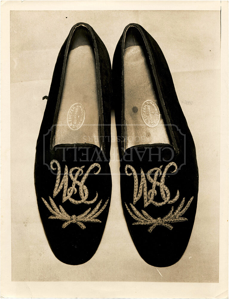 “A London firm has completed an order from Mr. Winston Churchill for two pairs of blue velvet carpet slippers embroidered with scrollwork in gold wire and with his initials in 2 1/4 gold letters on the toes. They cost $14 a pair. The first pair were ordered during the war, and Mr. Churchill wore them with his siren suit. Photo shows: Mr. Churchill’s ornate slippers, which will be sent to him tonight.”